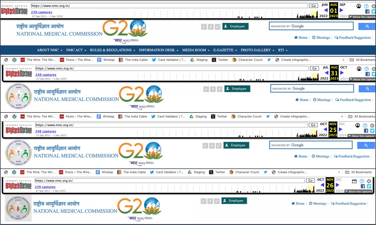 On August 1, 2023, there is no logo on the NMC home page. The new logo with a Hindu god in black and white at the centre appears to have been added sometime in August. And the coloured version of the god appears for the first time on the NMC homepage on November 26, 2023.