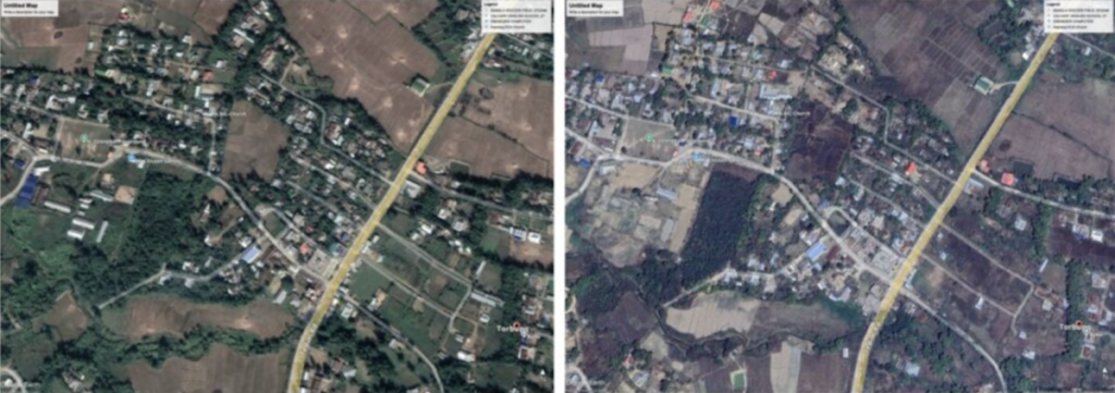 Torbung Bangal on May 8, 2023 and the same place on March 17, 2025. Photo: Google Earth.