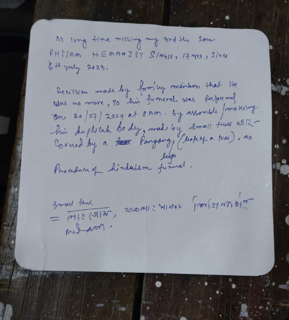 A handwritten note by Ibungobi Singh, written before the symbolic funeral of his missing son, Phisam Hemanjit Singh.