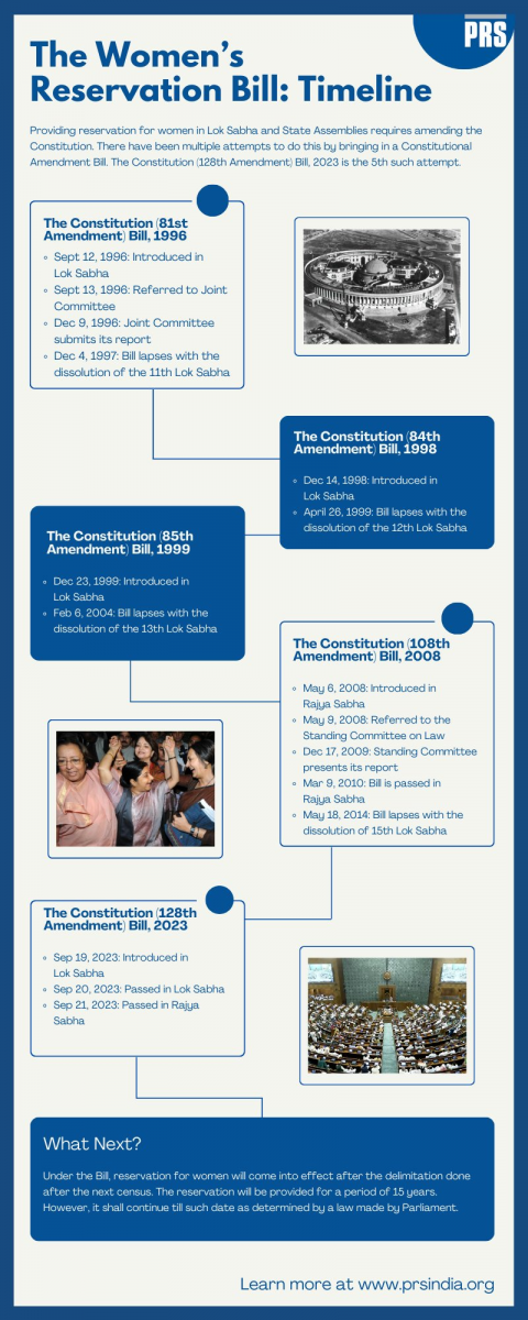 The Bill states that one-third of seats will be reserved for women in the legislative assembly of the National Capital Territory of Delhi by amending Article 239AA, in the Lok Sabha by amending Article 330, and in state legislative assemblies by amending Article 332.