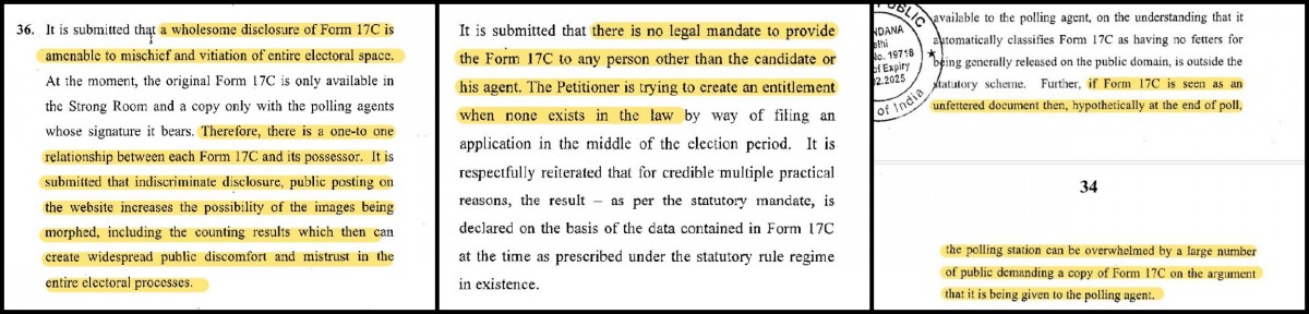 "It is submitted that a wholesome disclosure of Form 17C is amenable to mischief and vitiation of entire electoral space. At the moment, the original Form 17C is only available in the Strong Room and a copy only with the polling agents whose signature it bears. Therefore, there is a one-to one relationship between each Form 17C and its possessor. It is submitted that indiscriminate disclosure, public posting on the website increases the possibility of the images being morphed, including the counting results which then can create widespread public discomfort and mistrust in the entire electoral processes."