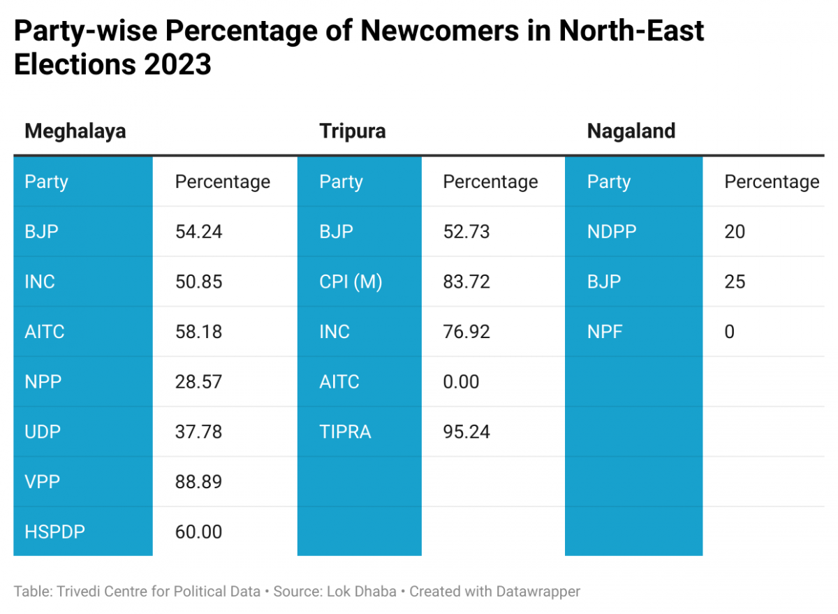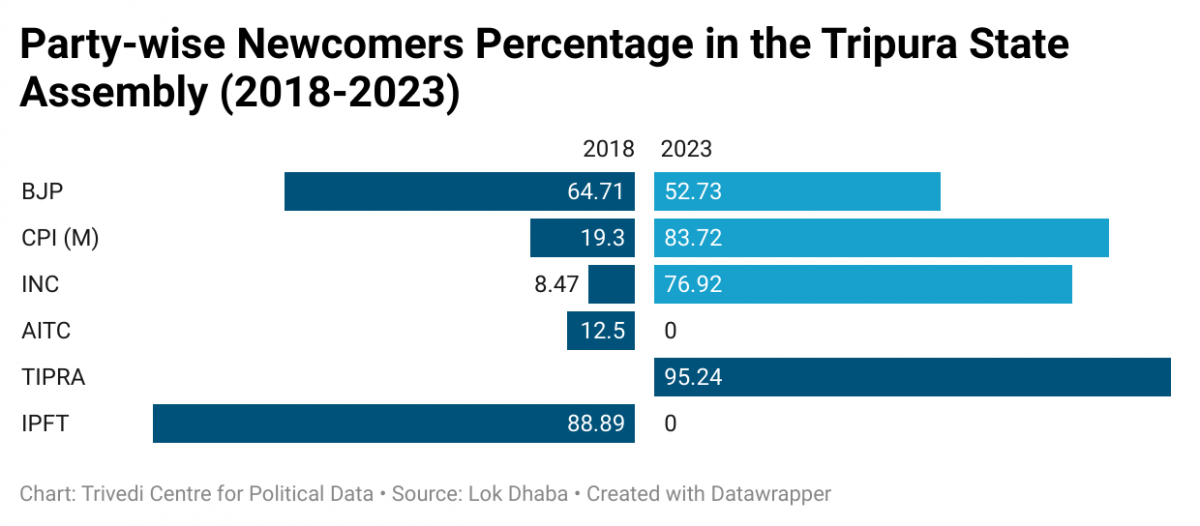 In Tripura, however, a fairly large number of first-time contestants won this year. Of the 32 seats that the BJP bagged, 40% were won by newcomers; 12 of the 13 seats that the Tipra Motha Party won were also bagged by new entrants; and around 8 of the 11 CPM winners were newcomers.