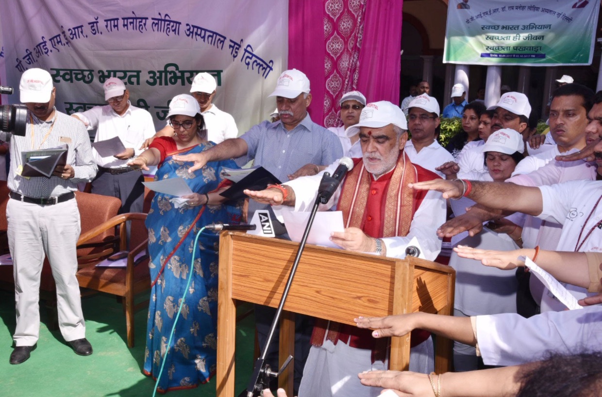 Minister of state for Health & Family Welfare Ashwini Kumar Choubey administers a pledge during Swachhta Hi Sewa Abhiyan at RML Hospital in New Delhi. Credit: Twitter/DD News