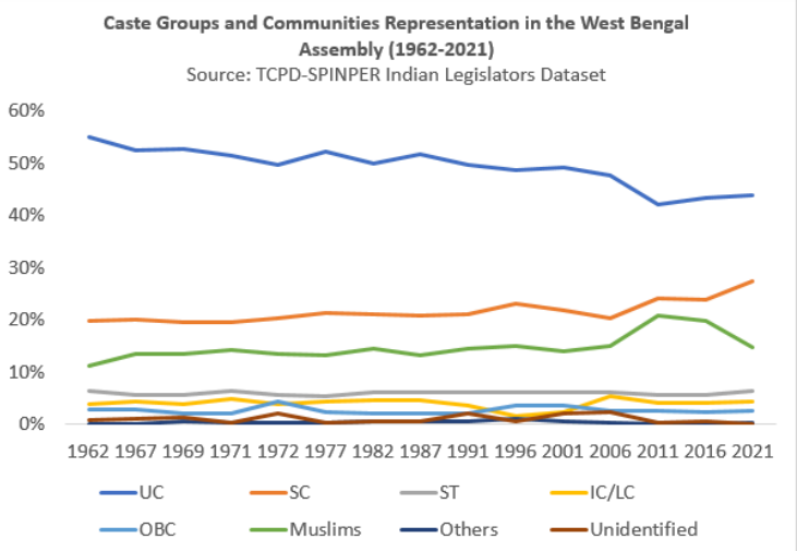 A critical inquiry into the socioeconomic trajectory of the Muslim community under the TMC government requires an examination of their representation within the upper echelons of governmental power. What has been the trajectory of Muslim representation in the cabinet of the West Bengal government and the legislative assembly? The victory of TMC in 2011 caused an uptick in the number of Muslim cabinet members. But it continued to fall in the subsequent elections, and in the last election of 2021, it eventually fell to 2006 levels. The share of Muslim MLAs followed the same path. TMC even fielded less number of Muslim candidates than the LF+Congress alliance in 2021.