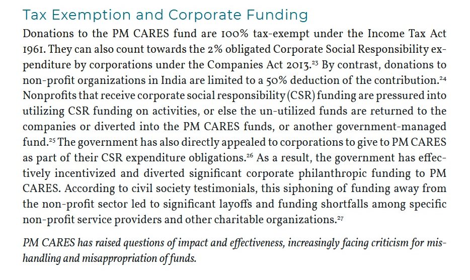Repeated appeals from and on behalf of PM CARES, highlighting the attractive terms it offered, also affected the fate of other nonprofit organisations. For instance, donations to PM CARES are 100% tax-deductible, which is not the case for many other nonprofits. This enabled PM CARES to attract more CSR funding from companies than comparable organisations.