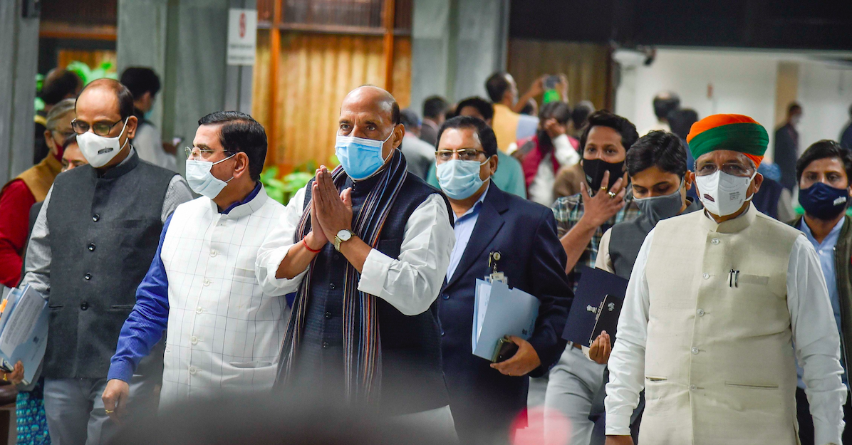 Defence Minister Rajnath Singh with Parliamentary Affairs Minister Pralhad Joshi at an all party meeting ahead of the winter session of Parliament, in New Delhi, Sunday, Nov 28, 2021. Photo: PTI