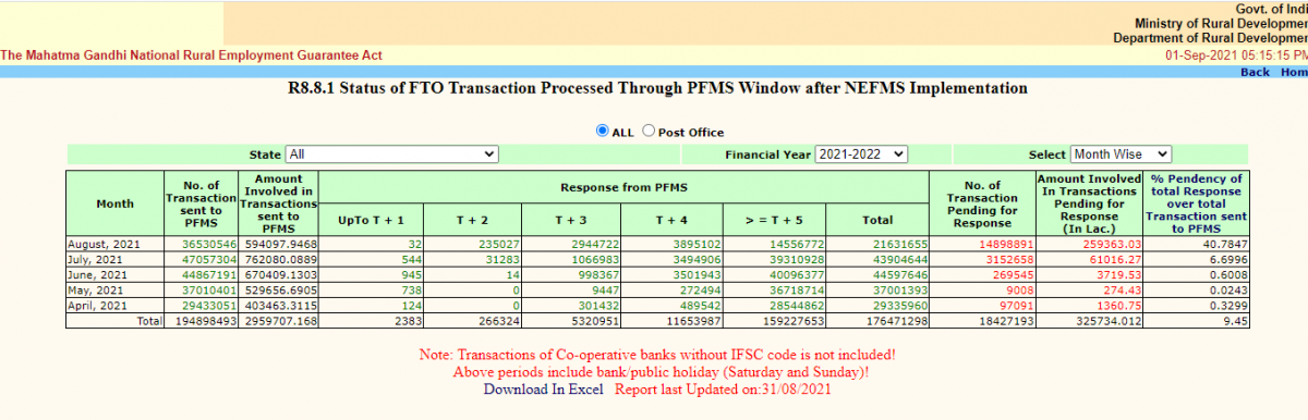 While payments are routinely delayed – even the central delays are very frequent – the MIS will keep showing that bulk of the payments are generated within 15 days. For example, as of September 1, 40% of payments for the month of August are pending from the central government, as per Report no. R.8.8.1 in the official website. These payments amount to about Rs. 2,593 crore of wages. However, on the same website, it shows that 99% payments have been generated on time.