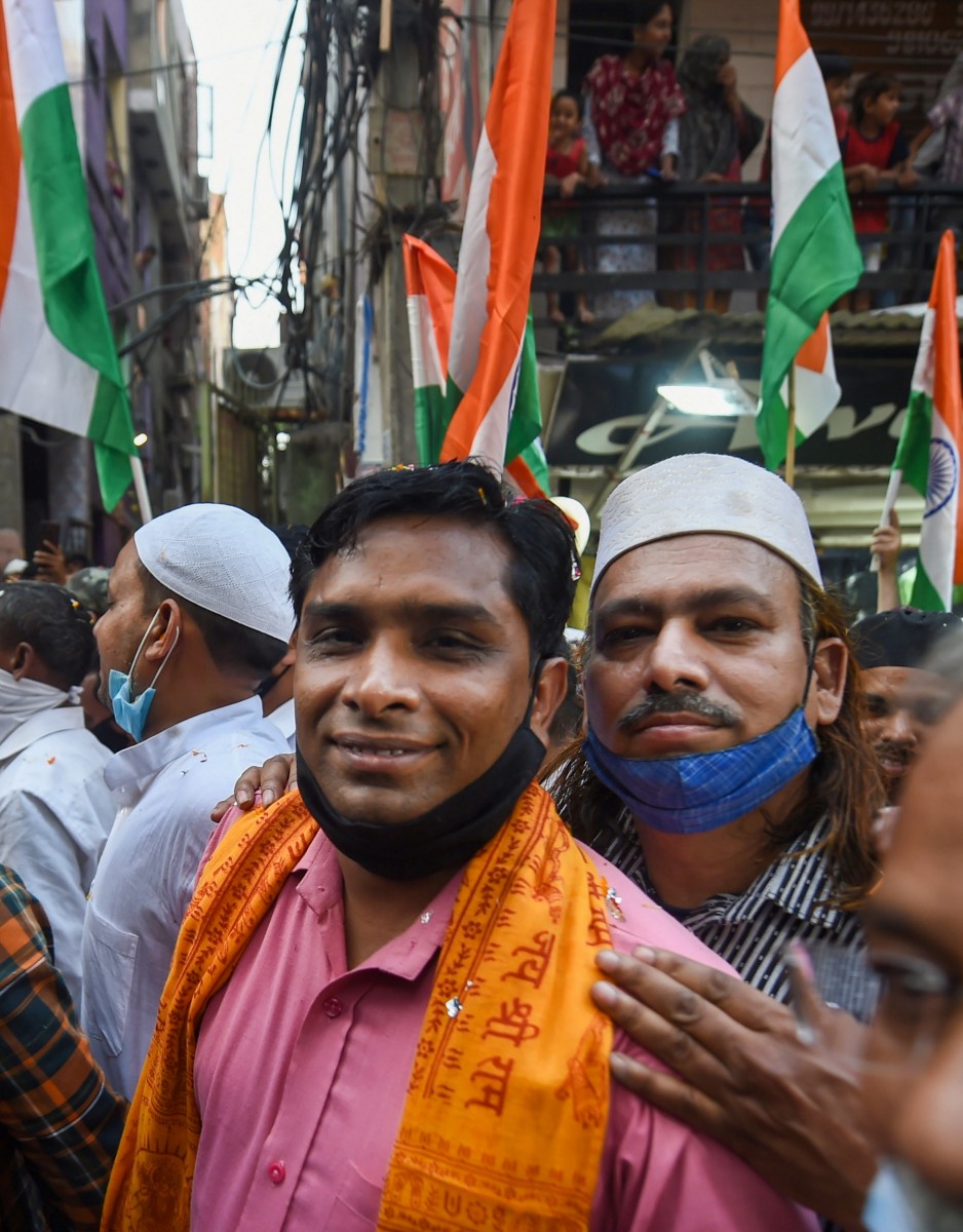 Members of both Hindu and Muslim communities during a Tiranga Yatra at the communal violence-hit Jahangirpuri area, in New Delhi, Sunday, April 24, 2022. Photo: PTI/Shahbaz Khan
