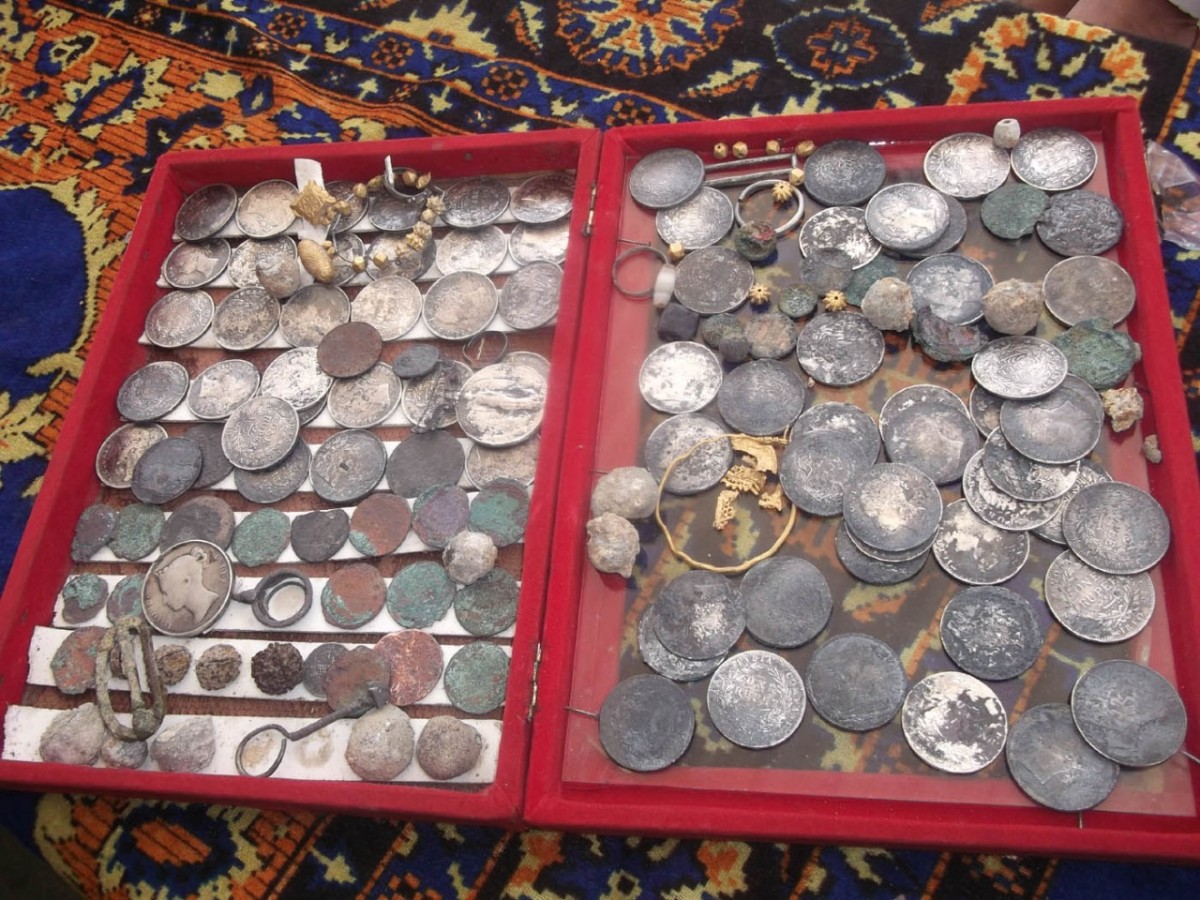 East India company coins, gold rings, necklaces, uniform stars, badges, belt buckles recovered from the well. Photo: Kusum Arora