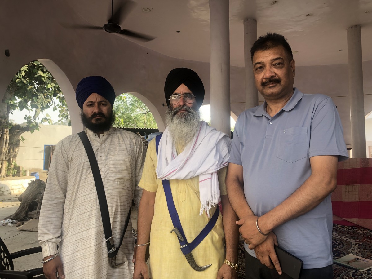 Surinder Kochhar (in grey), gurdwara secretary Kabal Singh Shahpur (in yellow) and gurdwara granthi Jajwinder Singh at the martyrs’ well. Photo: Kusum Arora