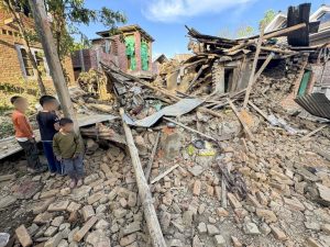 The destroyed house of Pahalgam terror attack suspect Zakir Ahmad Ganie after a blast in Matalhama area of Kulgam district, J&K, Saturday, April 26, 2025. Photo: PTI. [The children's faces have been blurred in accordance with laws on minors.]