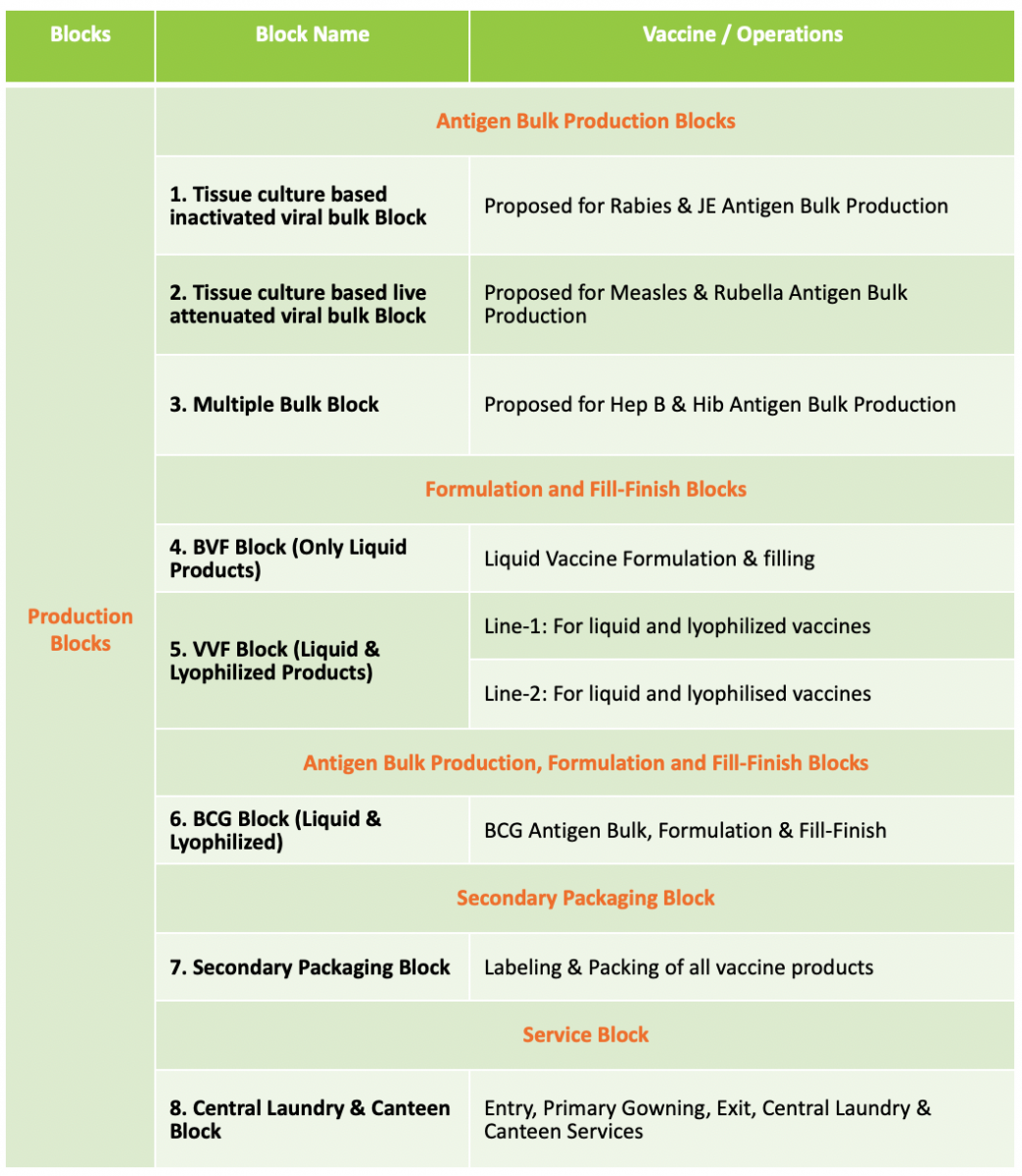 In 14 blocks, It has 5 bulk vaccine antigen production units and 4 formulation units. It also has 4 filling lines with 200 vials / min speed. Only commissioning and validation is pending.