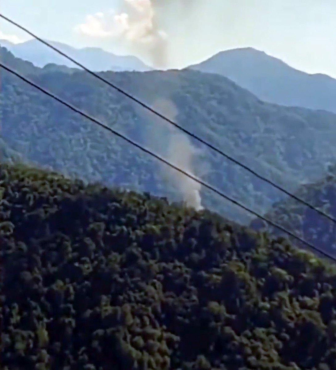 Smoke billows after an advanced light helicopter of the Indian Army crashed at Migging in Upper Siang district of Arunachal Pradesh, Friday, Oct. 21, 2022. Photo: PTI.