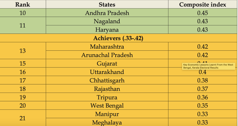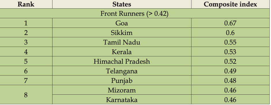 States like Maharashtra, Arunachal Pradesh, Gujarat, Uttarakhand, Chhattisgarh, Rajasthan, Tripura, West Bengal, Manipur and Meghalaya are categorised as ‘Achievers’. These states have good provisions of access to (socio-economic) opportunities and must sustain their efforts to advance to the next category. Lastly, states such as Goa, Sikkim, Tamil Nadu, Kerala, Himachal Pradesh, Telangana, Punjab, Mizoram and Karnataka are observed as ‘Front Runners’ in ensuring better access to basic socio-economic opportunities for their respective state-populations.