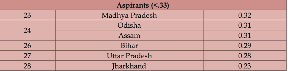 Based on the score range of 0.67-0.23, states are grouped into three categories – ‘Aspirants’ (below 0.33), ‘Achievers’ (0.42-0.33) and ‘Front Runners’ (above 0.42). Bihar, Uttar Pradesh, Jharkhand, Assam, Odisha and Madhya Pradesh fall under ‘Aspirants’, requiring sustained efforts to improve ‘access’ to basic socio-economic opportunities (across all identified pillars).