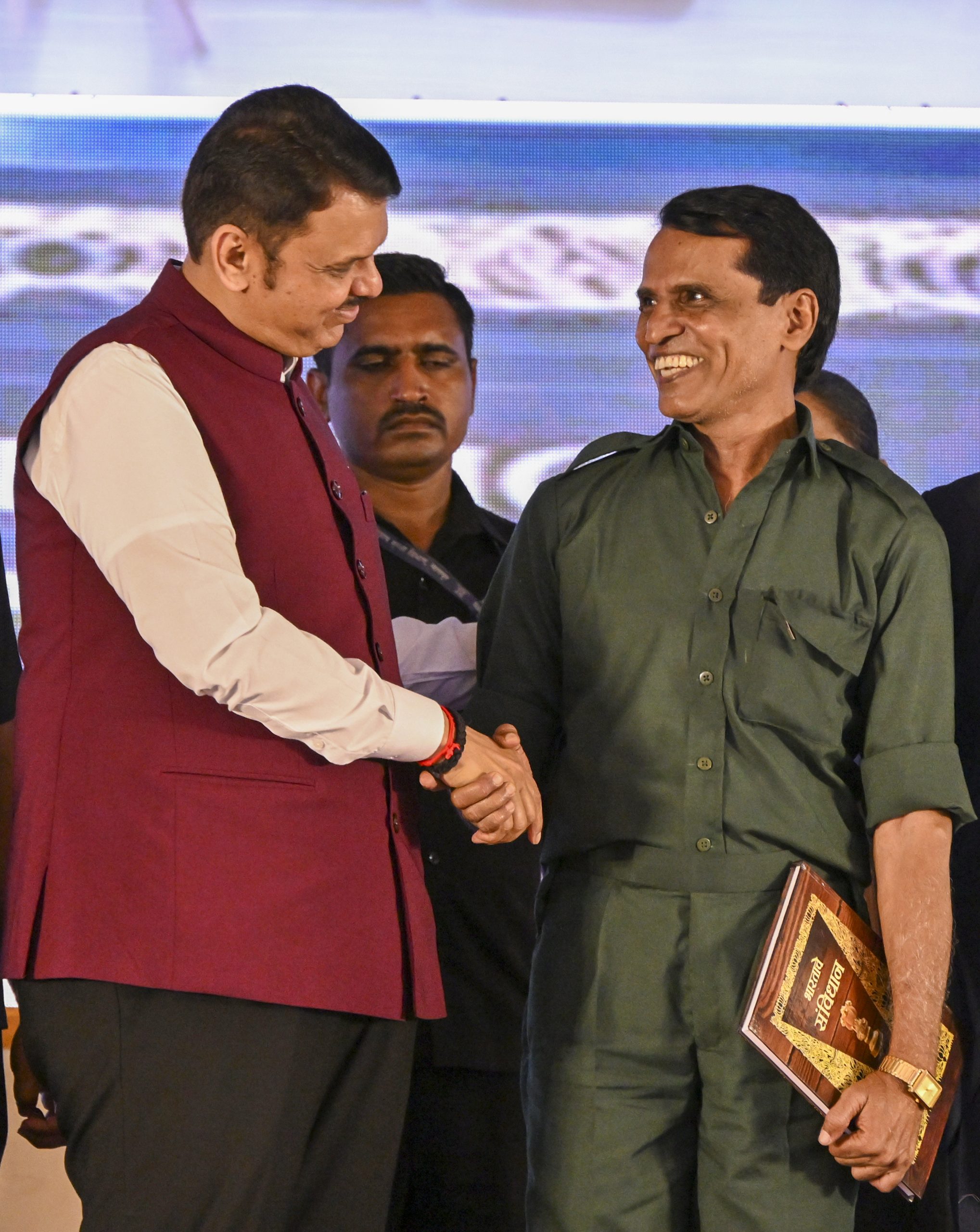 Maharashtra Chief Minister Devendra Fadnavis and Senior Naxal leader Mallojula Venugopal Rao, alias Bhupathi, as the latter along with 60 cadres surrender in Gadchiroli, October 15, 2025. Photo: PTI.