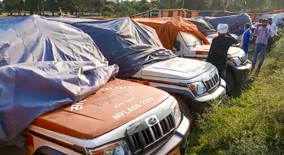 Ambulances found unused, covered with tarpaulin and parked, on premises belonging to the BJP MP Rajeev Pratap Rudy in Bihar, Saturday, May 8, 2021. Photo: PTI.