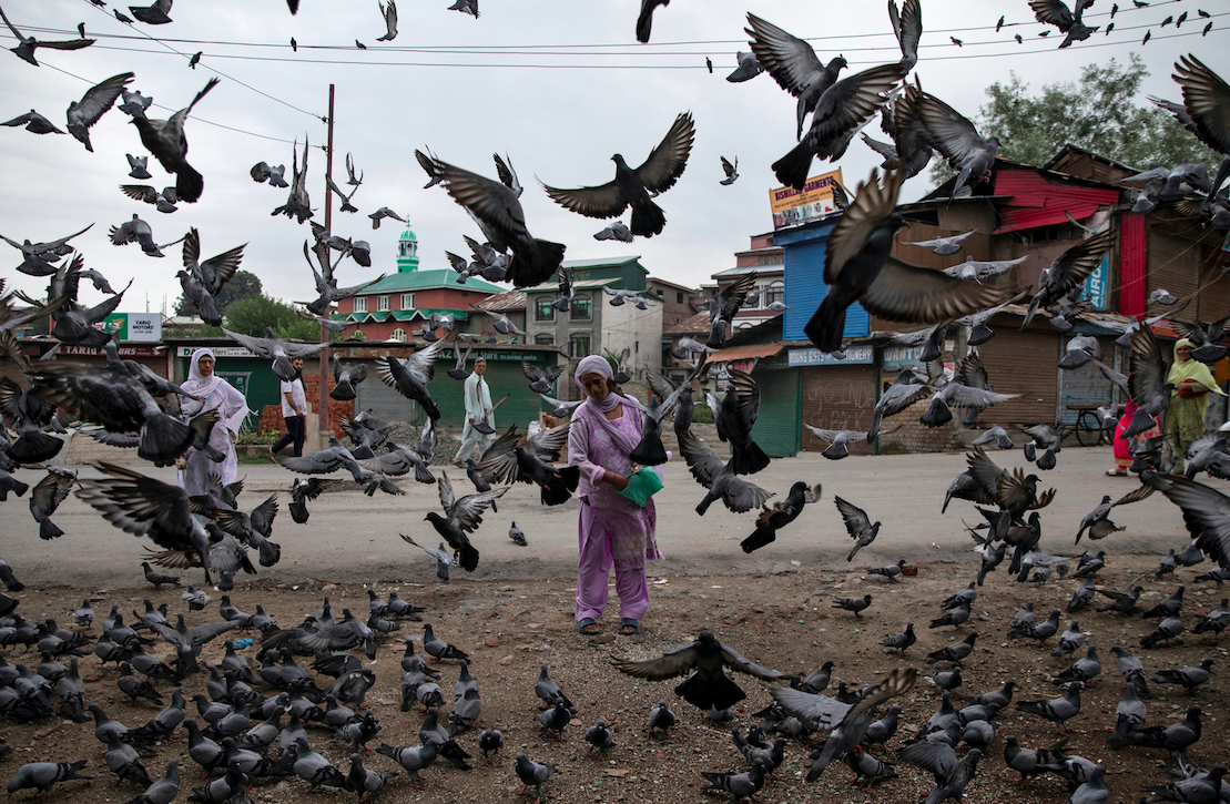 A Kashmiri woman feeds pigeons at a street during restrictions after the scrapping of the special constitutional status for Kashmir by the government, in Srinagar, August 11, 2019. REUTERS/Danish Siddiqui