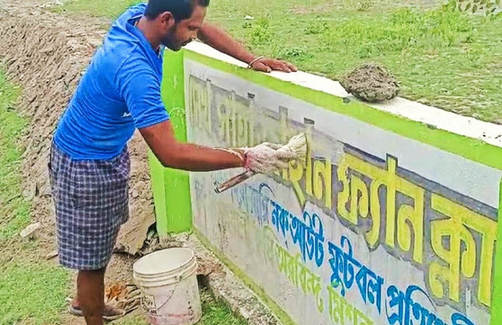 A man paints over the sign 'Sheikh Shahjahan Fan Club'. Photo: By arrangement.