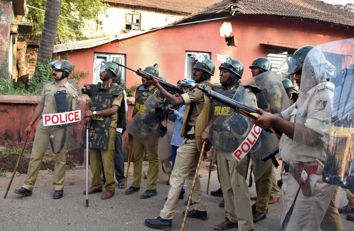 Policemen aim their guns during a protest against a new citizenship law, in Mangaluru, India, December 19, 2019. Photo: Reuters/Stringer