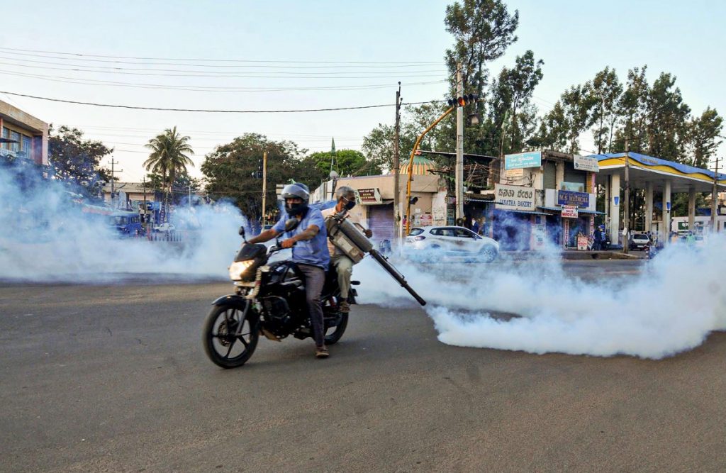 Health workers spray disinfectant in Chikmaglur, March 28, 2020. Photo: PTI