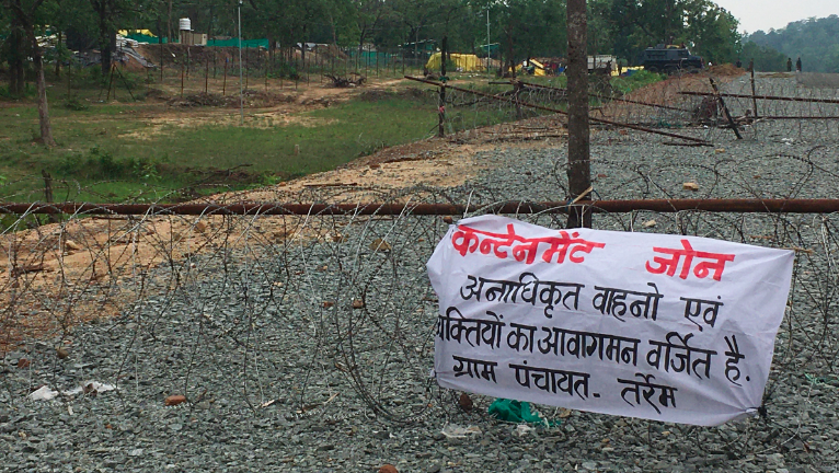 At Silger camp, we were stopped by a sign saying ‘containment zone: do not enter’ pinned to the third layer of concertina wire. The wire stretched across the road into the forests on either side. Three cattle have died and 17 injured as they get caught in the barbed wire. When I told one of the CRPF men they should compensate the villagers, he replied indifferently saying the cattle would get used to it and stop crossing. The police was out in full battle gear with shields, and a tank which they parked just inside the wire.