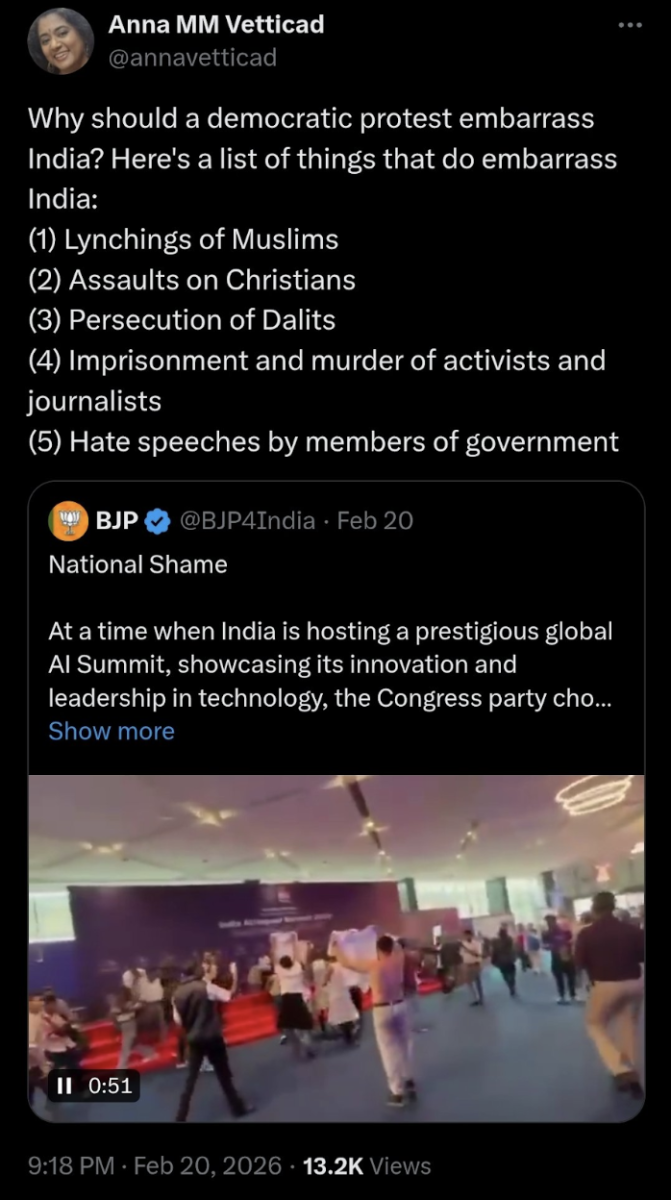 The notice was in connection with Vetticad’s X post on February 20, when she questioned the Bharatiya Janata Party (BJP)’s post calling the Indian Youth Congress’s protest at the AI Summit last week a “national shame”. She asked why a democratic protest is a matter of “shame” while attacks on Muslims and Dalits, or hate speech by government leaders, is not. It is unclear whether the blocking order for Vetticad’s post on X came via the Union ministry of home affairs (MHA)’s contentious Sahyog portal, as the social media platform has challenged the government’s use of the portal in court.