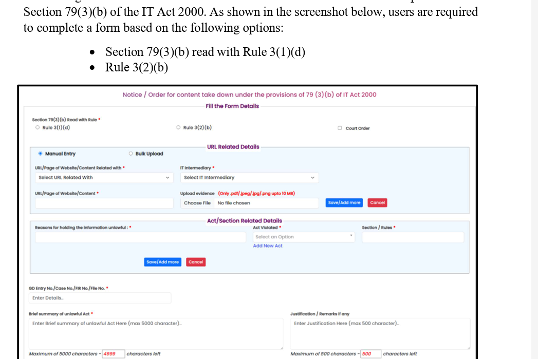 Here, the manual shows, either a manual entry can be made or a bulk upload – which will provide for more than one URL/page of the website to be listed for takedown – can be chosen. Providing supporting evidence, on the other hand, is optional.