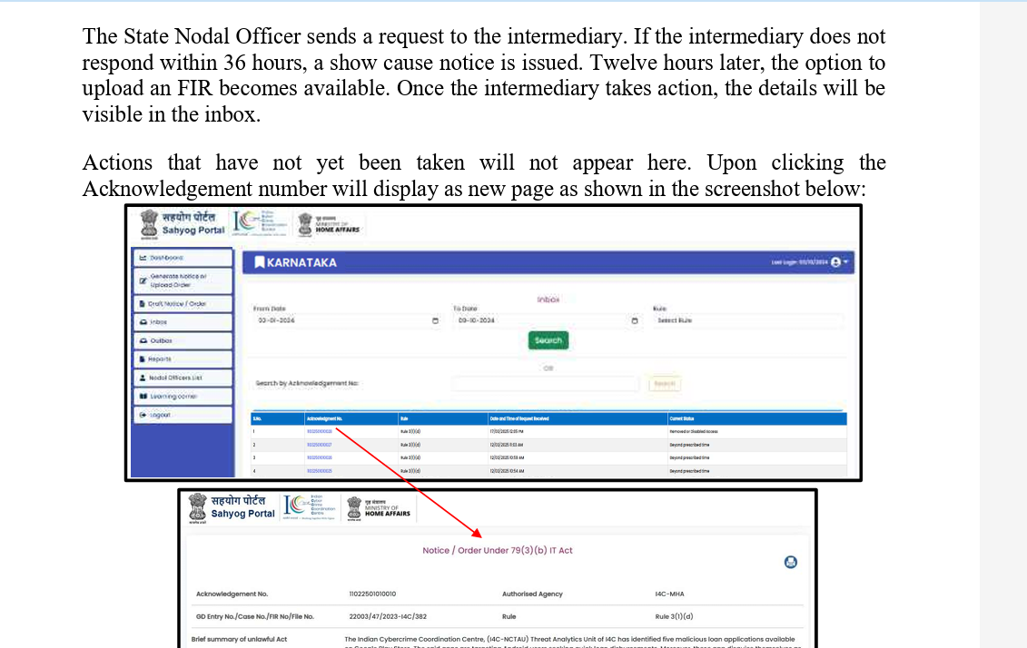 “The State Nodal Officer sends a request to the intermediary. If the intermediary does not respond within 36 hours, a show cause notice is issued. Twelve hours later, the option to upload an FIR becomes available. Once the intermediary takes action, the details will be visible in the inbox,” it says.