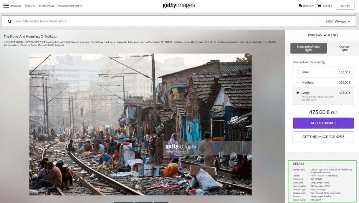 Using the same description, we performed a keyword search on Google and came across the original photo available on Getty Images. The photo is dated December 12, 2013. It represents a slum near railway tracks in Kolkata.
