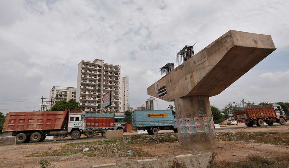 Vehicles travel past a Delhi-Jaipur national highway flyover under construction at Manesar in Haryana, July 24, 2014. Photo: Reuters/Adnan Abidi
