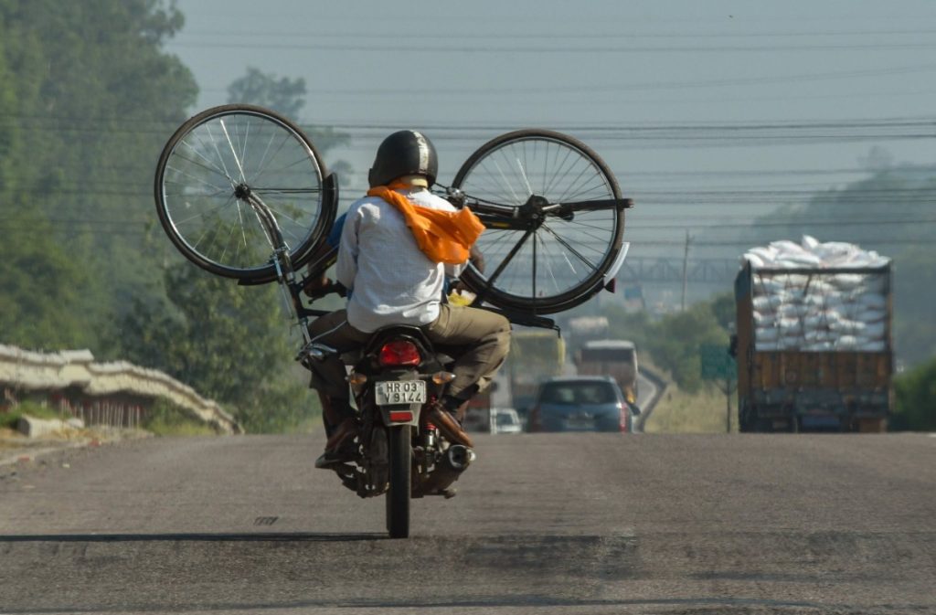 A migrant worker carries his cycle on a motorbike on the outskirts of Chandigarh. Photo: PTI