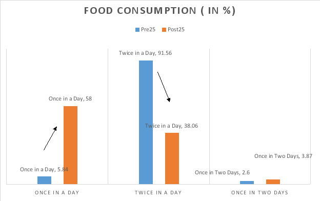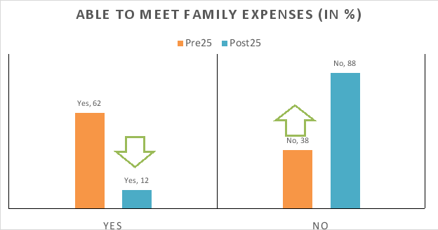 During the lockdown period, 59% of the workers reported that they were unable to meet their daily family expenses since they have lost their sources of livelihood. Due to the lack of income, more than 50% of workers reported that they reduced their food consumption to once in a day. There is also a massive decline in the availability of water in the source state. Around 71% of respondents said that they used to have access to sufficient water before the lockdown, but only 38% reported so during the lockdown. These aspects are extremely worrying as access to nutrition and water are critical to boosting immunity and maintaining hygiene to fight the pandemic, but people’s vulnerability to COVID-19 and other diseases is increasing as their access to food and water is falling.