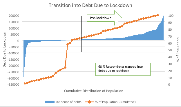 There is a substantial rise in the level of indebtedness in the lockdown period. Prior to the lockdown, approximately 40% of the respondents reported an average debt of Rs 53,000 per person. However, in the lockdown period, the intensity of indebtedness has been exacerbated for 68% of the respondents. The debt amount ranges from Rs 40,000 to Rs 2,80,000. The rise in indebtedness has been reported on account to household expenses, health emergencies, other emergency expenses due to the lockdown, and to meet expenses related to agriculture such as taking land on lease (batai) and buying fertilizers/inputs etc for the upcoming kharif season.