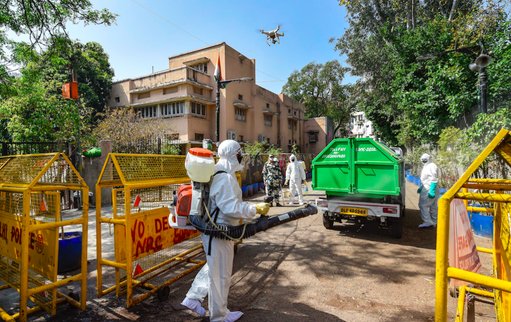 Health workers prepare to sanitise an area near Nizamuddin mosque on April 1. Photo: PTI