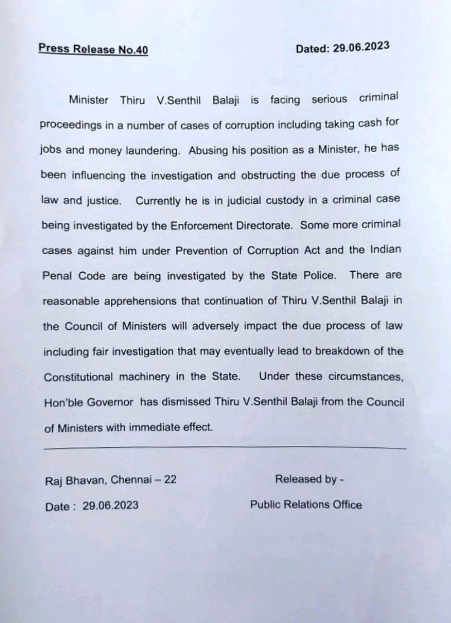 The press release adds that some more criminal cases against him under the Prevention of Corruption Act and the Indian Penal Code are being investigated by the state police. Then it adds: “There are reasonable apprehensions that continuation of Thiru V. Senthil Balaji in the Council of Ministers will adversely impact the due process of law including fair investigation that may eventually lead to breakdown of the Constitutional machinery in the State”.