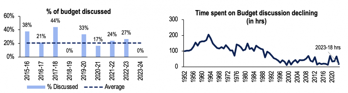 This has been the sixth shortest budget session since 1952. Lok Sabha spent 18 hours on financial business, of which 16 hours were spent on the general discussion of the budget. In the previous budget sessions of the 17th Lok Sabha, financial business was discussed for 55 hours on average.