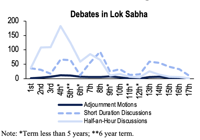 The Rules of Procedure of both Houses of Parliament provide for various devices which can be used to draw attention to matters of public importance, and hold the government accountable. These include half-an-hour discussions, short duration discussions, and adjournment motions. In the 17th Lok Sabha, only 11 short duration discussions and one half-an-hour discussion have been held so far. None were held in this session.