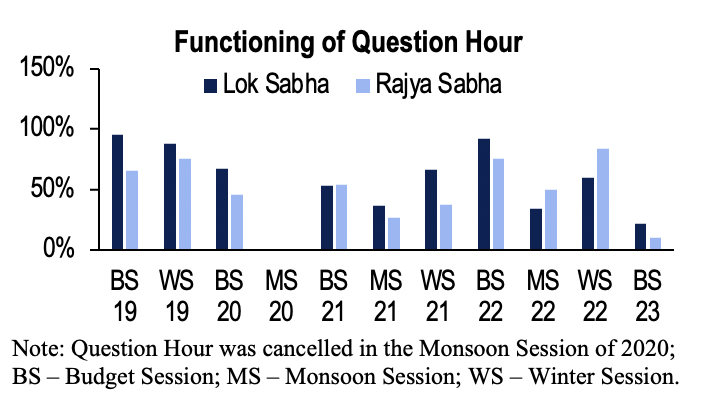 This session also saw the least amount of time spent on questions in the current Lok Sabha. Question Hour functioned for 19% of scheduled time in Lok Sabha and 9% in Rajya Sabha. About 7% of starred questions were answered in each House.
