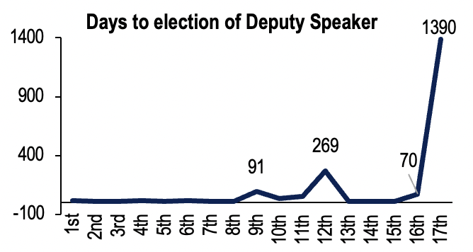 There has just been one instance in the past – 269 days during the 12th Lok Sabha – when it took over three months to elect a Deputy Speaker.