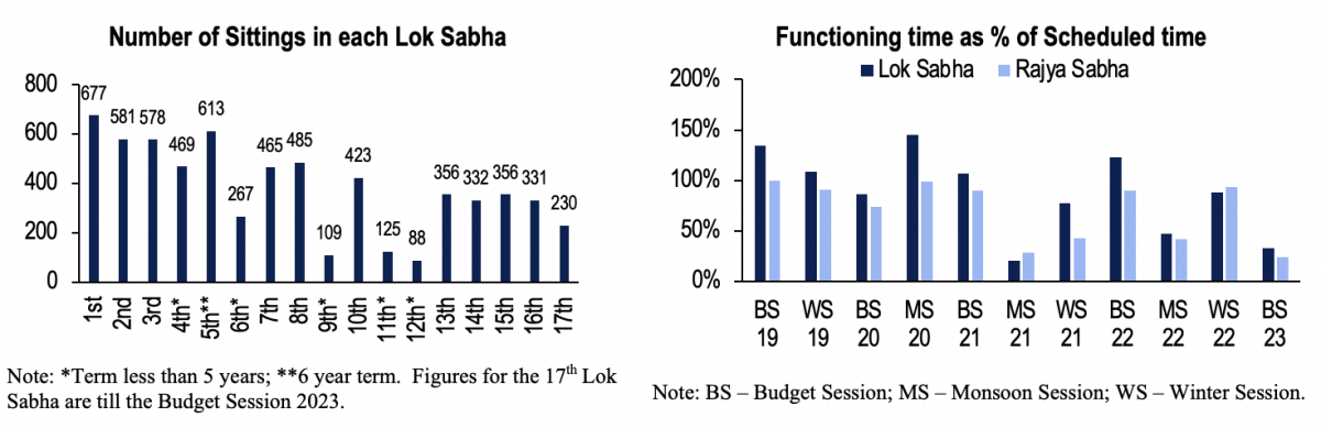 In this session, Lok Sabha functioned for 33% of its scheduled time (46 hours) and Rajya Sabha for 24% (32 hours). In the 15 days of the second part of the session, Lok Sabha worked for 5% and Rajya Sabha for 6% of scheduled time, with most of the time spent on the procedural work of tabling papers.