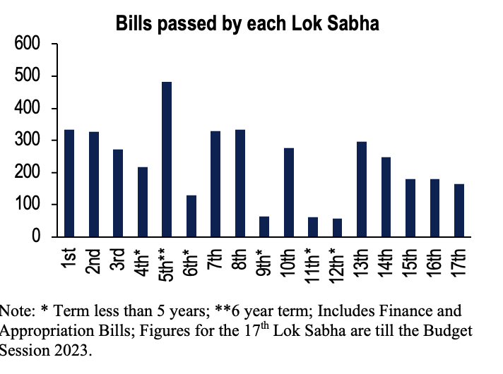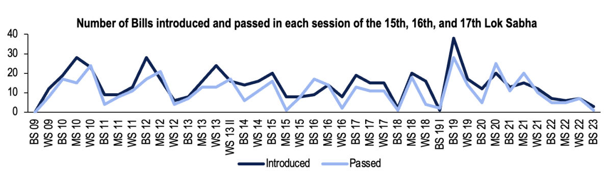 In this Lok Sabha, so far, 150 Bills have been introduced and 131 have been passed (excluding Finance and Appropriation Bills). In the first session, 38 Bills were introduced and 28 were passed. Since then, the number of Bills introduced and passed has declined. Fewer than 10 Bills have been introduced or passed in each of the last four consecutive sessions.