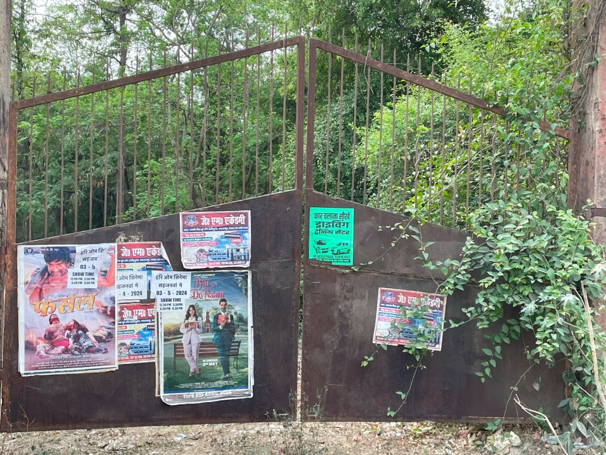 The locked gates of the closed spinning mill is now a sticker board for ads. Photo: Manoj Singh