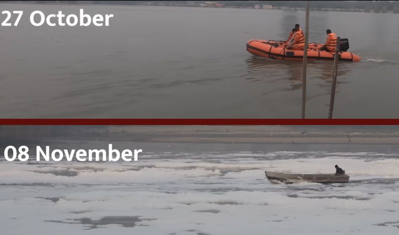 But once again, the Yamuna in Delhi is covered in toxic white foam. The cleaning that was showcased by the Delhi government at Kalindi Kunj Ghat a few days before has now completely disappeared.