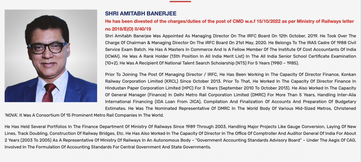 Amitabh Banerjee's page on the IRFC website now contains a note on him having been "divested of the charges/duties" of the CMD's post.