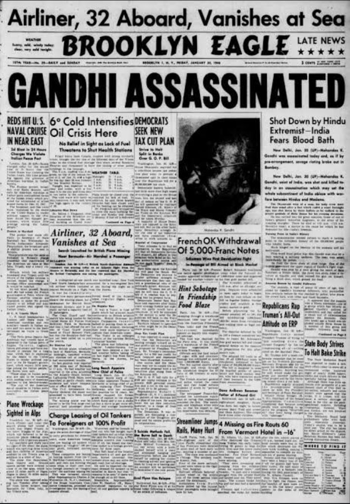 The news of Mahatma Gandhi’s assassination on January 30, 1948 was on the front page of several foreign newspapers. Below are a few examples: