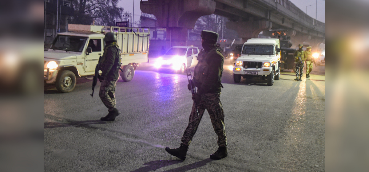 Security personnel leave after an encounter with militants near the Rambagh area of the city in Srinagar, Wednesday, Nov. 24, 2021. Three unidentified militants were killed in a brief shootout, police said. Photo: PTI.