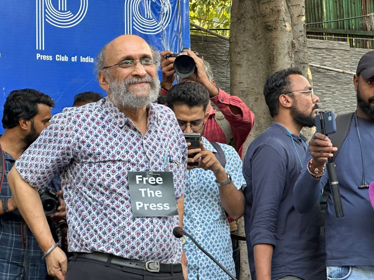 Journalist Paranjoy Guha Thakurta, who was questioned by the Delhi police, speaks at the Press Club of India, October 4, 2023. Photo: Yaqut Ali/The Wire