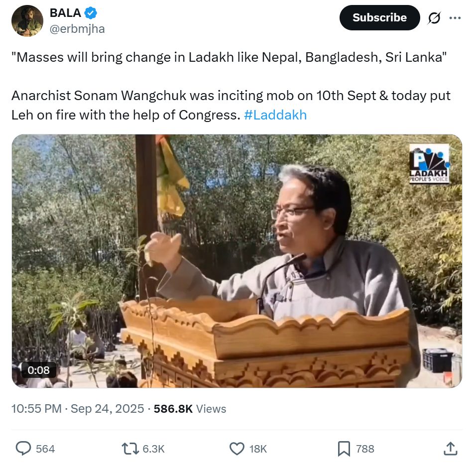 Indian Compass, an Instagram account linked to the BJP IT cell, also wrote that Sonam Wangchuk was inciting people to protest like in Nepal, Bangladesh and Sri Lanka.