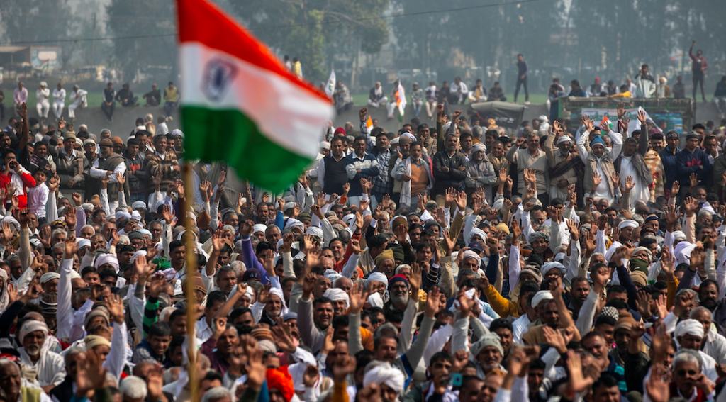 People attend a mahapanchayat meeting as part of a farmers' protest in Jind district of Haryana, February 3, 2021. Photo: Reuters/Danish Siddiqui